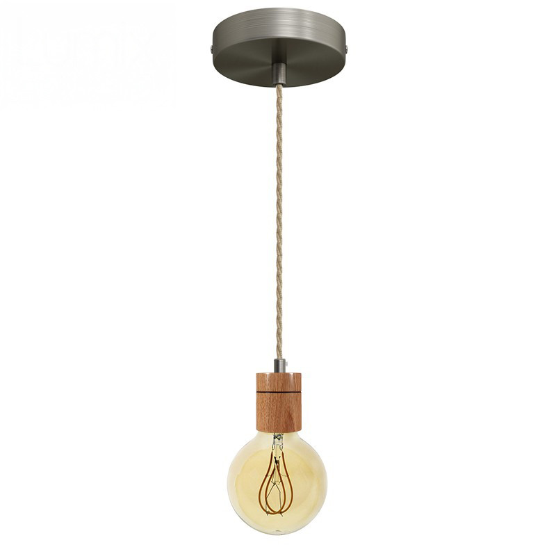 Suspension prestige porte-douille cylindrique bois chêne blanc et rosace métal inox satiné
